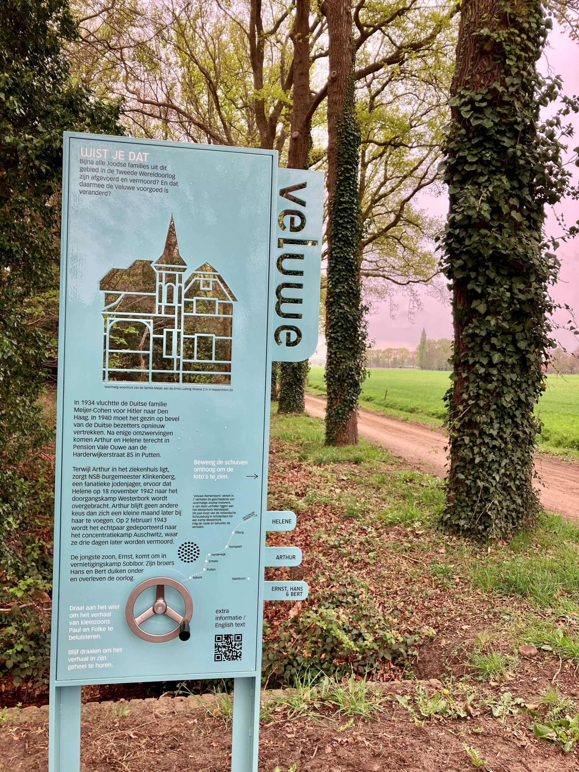 The interactive outdoor exhibits function as mini-exhibitions within the landscape. By turning a wheel, visitors can listen to the personal stories of families, told by eyewitnesses and relatives, via audio.