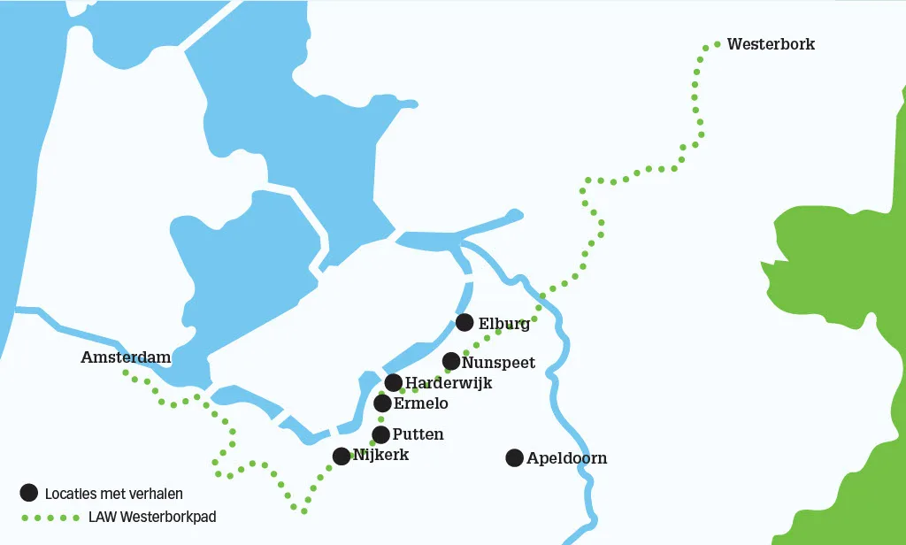 Six of these objects are located along the Westerborkpad, a 360-kilometer walking and reflection route from the Hollandsche Schouwburg in Amsterdam to the former Westerbork concentration camp. Along the way, walkers will pass sites commemorating the persecution of the Jews: from hiding places to labor camps and monuments.